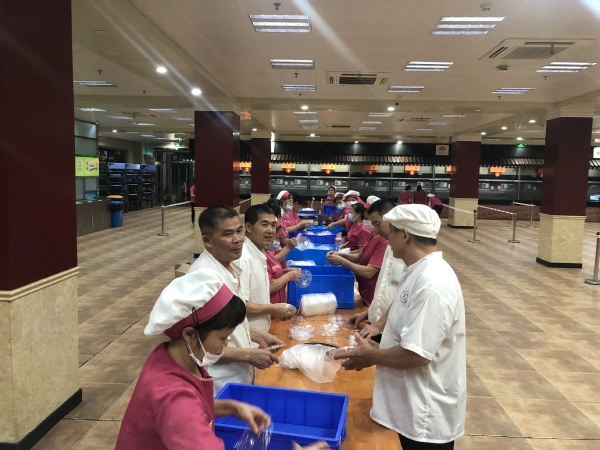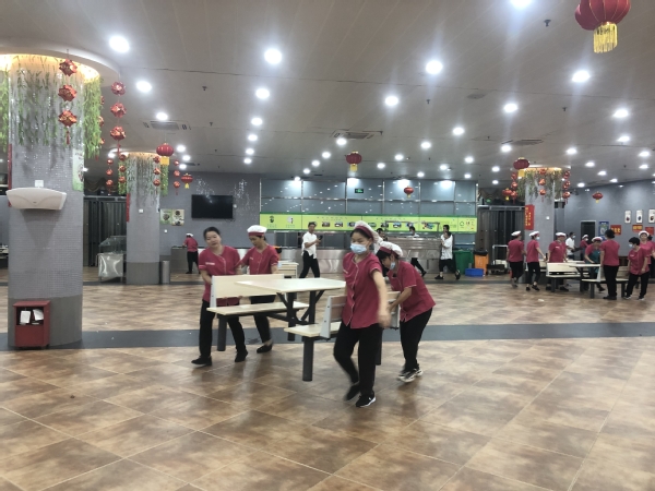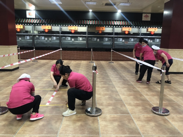 取消堂食前一天晚上,各餐厅连夜组织人员搬掉桌椅、张贴标识,布置排队窗口、排队设施、1米线、准备打包餐合等。
