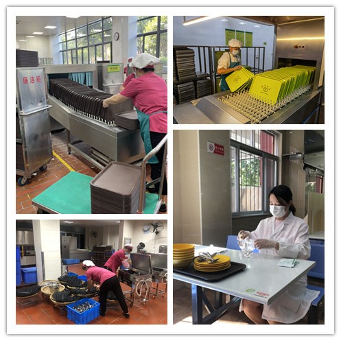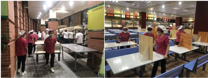 接到恢复堂食的通知后,5日晚,饮食服务中心各餐厅连夜搬抬桌椅、摆放隔板复位,餐具清洗消毒检测到位。
