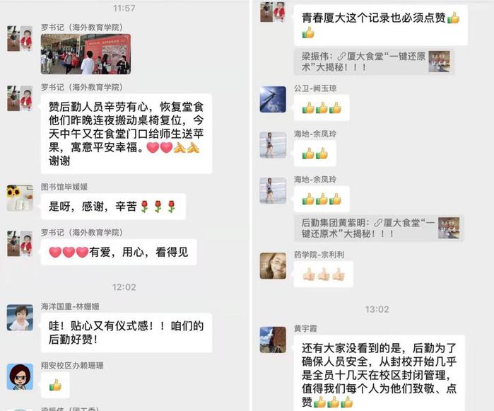 “永远不要忘记辛苦付出的人们,感谢厦大!感谢后勤叔叔阿姨们,你们就是最可爱的人。”“辛苦可亲可敬的食堂叔叔阿姨们。”……恢复堂食第一天,师生们纷纷发帖,点赞后勤人的坚守、奉献。