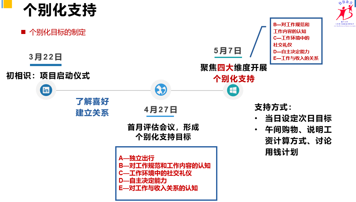 个别化支持方案:相比第一期职业素养项目,本学期的进步之处在于BB&S团队基于多方的信息收集,结合实习生个人特点、发展目标及工作任务及环境要求,聚焦四大维度(对工作规范和工作内容的认知、工作环境中的社交礼仪、自主决定能力、工作及收入关系的认知)开展个别化支持。