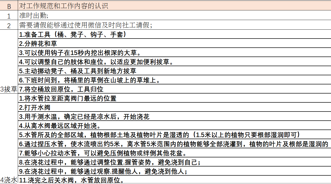 准时上下班;主动调整位置、主动倒草、不频繁发呆、正确使用钩子、按照浇水步骤操作、避免浇到自己和他人;