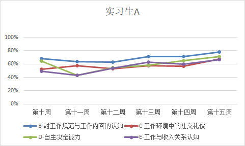 实习生的变化:在个别化目标及支持计划确定后,使用完整的评估工具共计评估5周(5月10日-6月11日),共计100人次参与评估问卷填写。通过下文图表不难看出,两名实习生在个别化的支持下,对工作规范和工作内容的认知、工作环境中的社交礼仪、工作及收入关系的认知都是呈现上升的趋势。