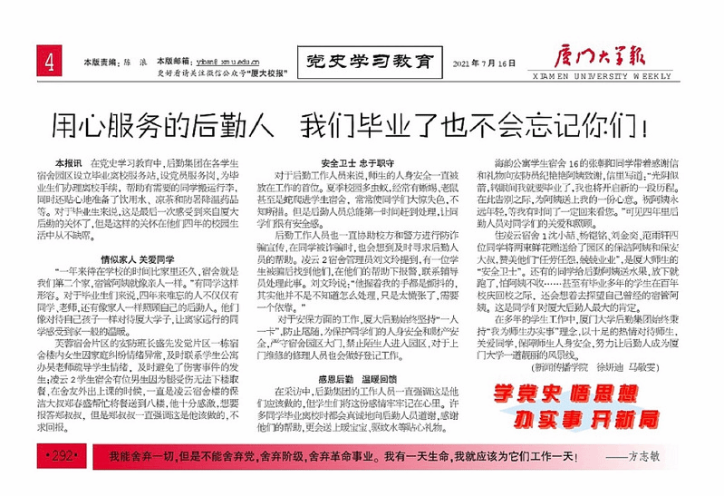 厦门大学报7月16日刊登该《用心服务的后勤人 我们毕业了也不会忘记你们!》文章,介绍了后勤人把学生当家人,用心用情服务师生,帮助毕业生办理毕业手续,帮助毕业生搬运行李,毕业生回首四年的校园生活,感受后勤人点点滴滴的关怀照顾和用心服务,感恩回馈,向后勤叔叔阿姨送花、写感谢信,争相合影……(厦门大学新闻网7月6日也刊登《后勤人用心服务 毕业生感恩回馈》文章,今日头条同日转发该篇文章)