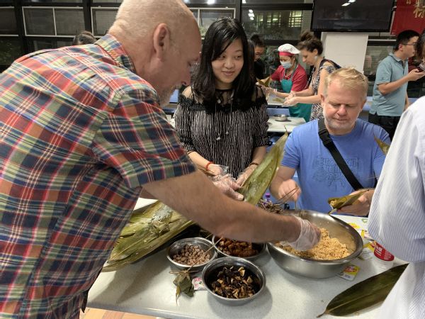 “结果虽甜,过程不易。”“师傅”手把手地教,“徒弟”一招一式地学。特别是外教老师,通过学习体验包粽子的过程,感受到了中华传统文化的博大精深。大家边包粽子,边唠“家常”,谈笑间一个个粽子不断地“诞生”。看着样式不同、大小不一的粽子,师生们不禁感叹:包粽子其实也不容易,餐厅要提供那么多美观有型、口感软滑的粽子更是不易,我们应该给默默奉献的后勤人多一份理解与宽容。