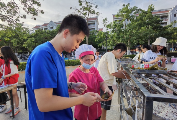6月14日端午节当天下午,翔安校区在竞丰餐厅外广场举办“我们的节日--端午节”系列活动。餐厅服务员热情耐心地边讲解边示范包粽子的步骤方法,阿姨们教的认真,同学们也学的津津有味,很多同学是第一次参加这样的活动,他们表示包粽子看似简单的几步做起来可真不容易。