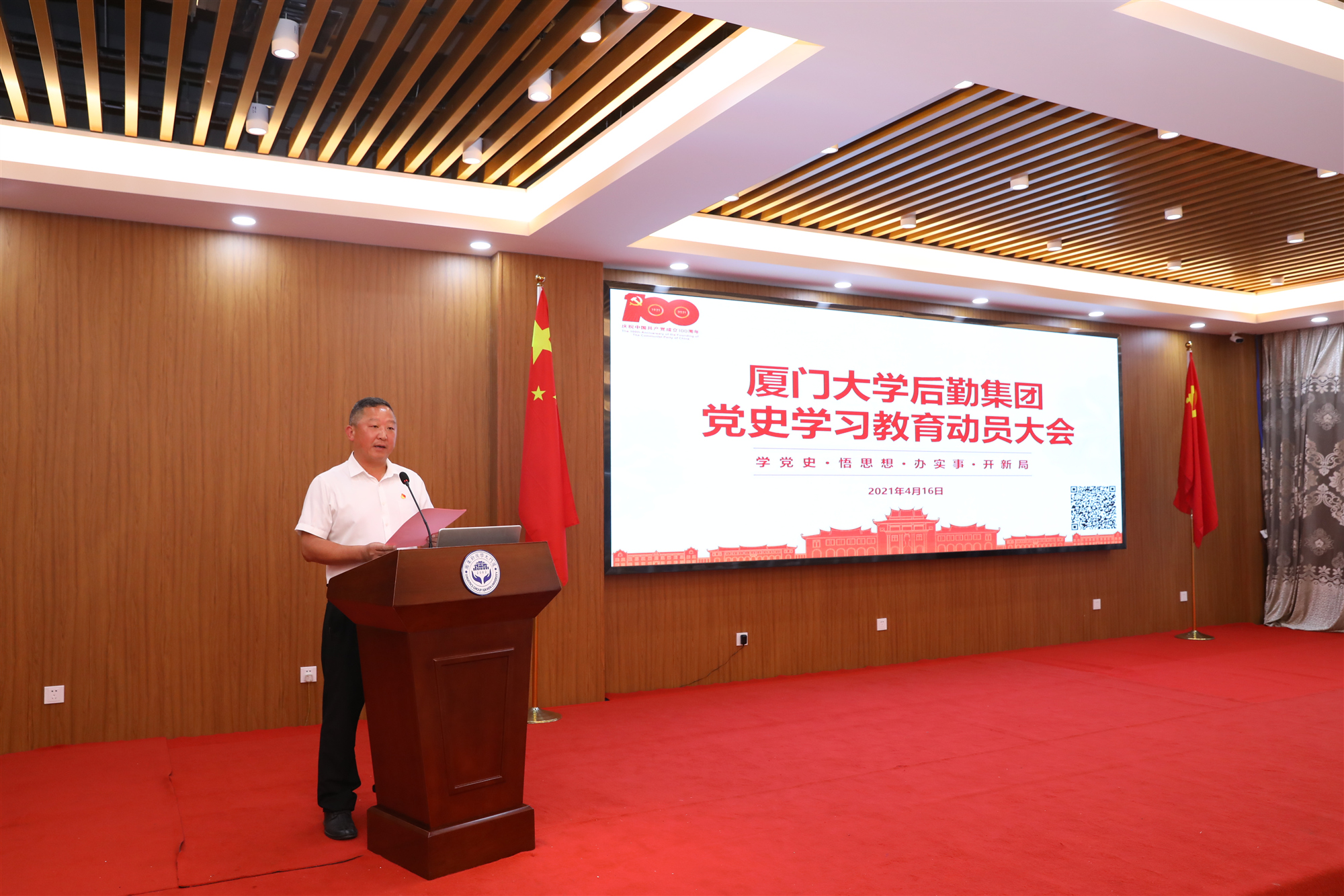 4月16日下午,后勤集团党史学习教育动员大会在东苑餐厅二楼会议室召开。集团领导班子成员、一级岗人员、各支部书记、全体党员、党外人士及群众代表参会。学校党史学习教育第五指导组组长杨敬达、副组长葛郝锐、联络员袁愉年到会指导。集团总经理林公明主持会议。