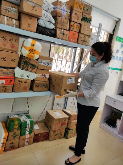 今年寒假留校学生增多,加上防疫要求,学生公寓环境服务中心邮政收发快递工作任务加重,邮政工作人员从严从细落实防疫要求,强化场所管理和邮件消毒,确保收发邮件快递安全有序。