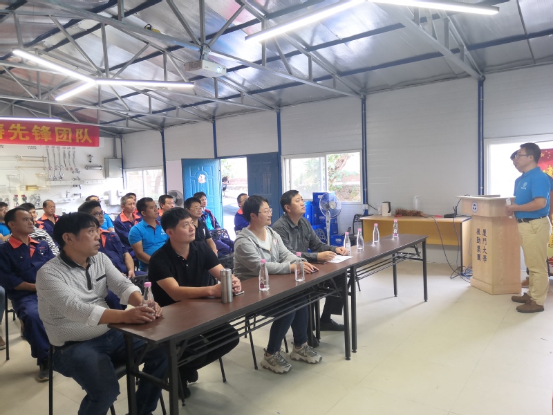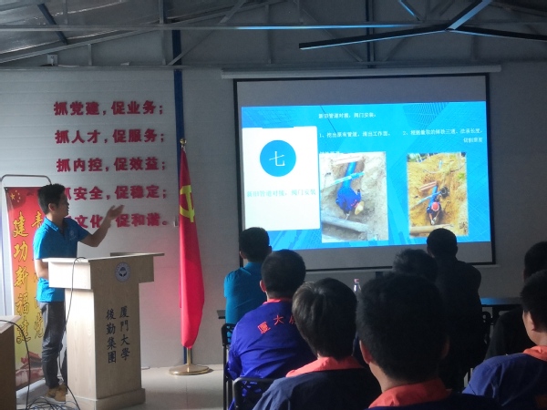 此次培训,由来自翔安校区水电管理部的柯靖超主讲,他就翔安校区今年以来实施的二次供水管网安装进行了案例分析。课程以PPT形式图文并茂地详细讲述了施工主要流程,并通过借助视频播放讲解施工安装工艺,在场的水电维修师傅进一步巩固提升PE管安装施工技术、学习了解管道敷设中非开挖(顶管)施工技术,共同提升水电服务技能。