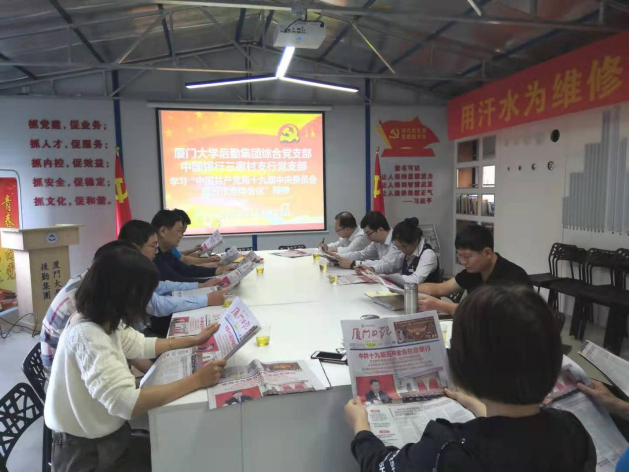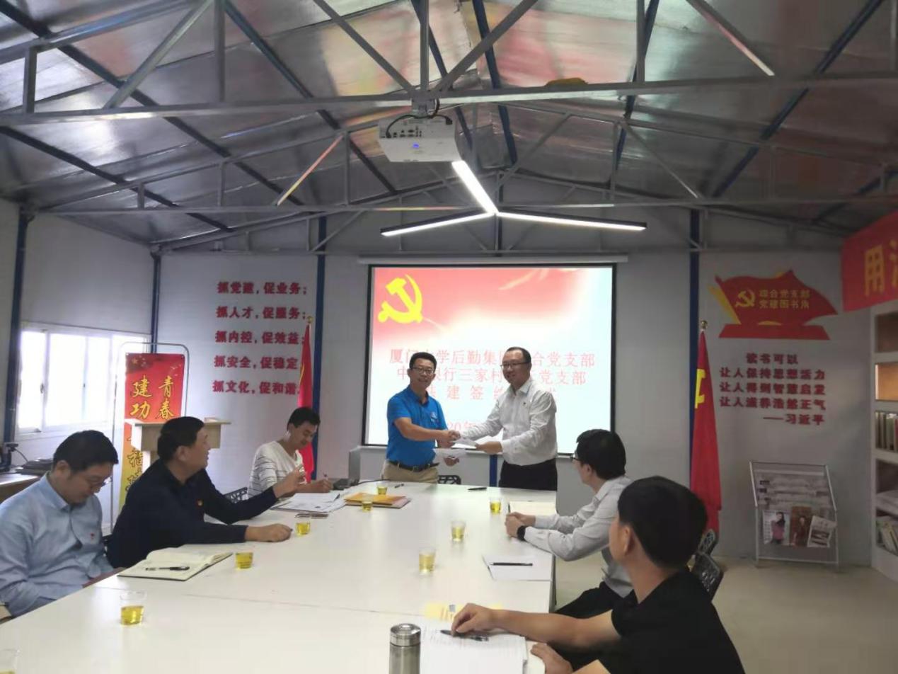 11月11日下午,为贯彻落实党的十九大精神和习近平总书记系列重要讲话精神,深入开展“三型”党组织创建活动,促进党建工作与业务工作深度融合,厦门大学后勤集团综合党支部与中国银行三家村支行党支部在水电实训室举行党支部共建签约仪式。支部联系党员领导干部、集团副总经理王裕民主持仪式,中行三家村支行党支部书记、行长谢哲伟,集团综合党支部书记、水电服务中心主任张建波,两个党支部的全体党员及积极分子参加。