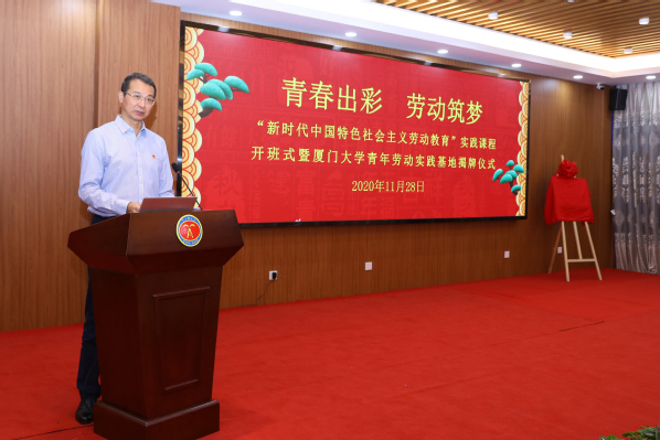 劳动是一切幸福的源泉。赖虹凯副书记首先代表校党委对青年劳动实践基地的挂牌表示热烈的祝贺。他表示,学校党委高度重视学生劳动教育工作,多次研究、周密部署,在全国高校当中率先推出了新时代劳动教育行动计划,开设了《新时代中国特色社会主义劳动教育》选修课程。这次举行厦门大学青年劳动实践基地挂牌仪式,是我校贯彻落实中共中央、国务院《关于全面加强新时代大中小学劳动教育的意见》和习近平总书记在全国劳动模范和先进工作者表彰大会讲话精神的重要举措之一,也是学校2020年新时代劳动教育“八大行动计划”中的一项积极探索和创新。