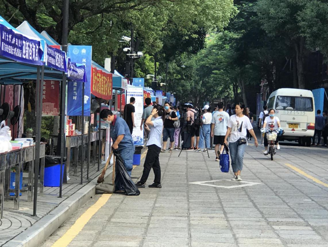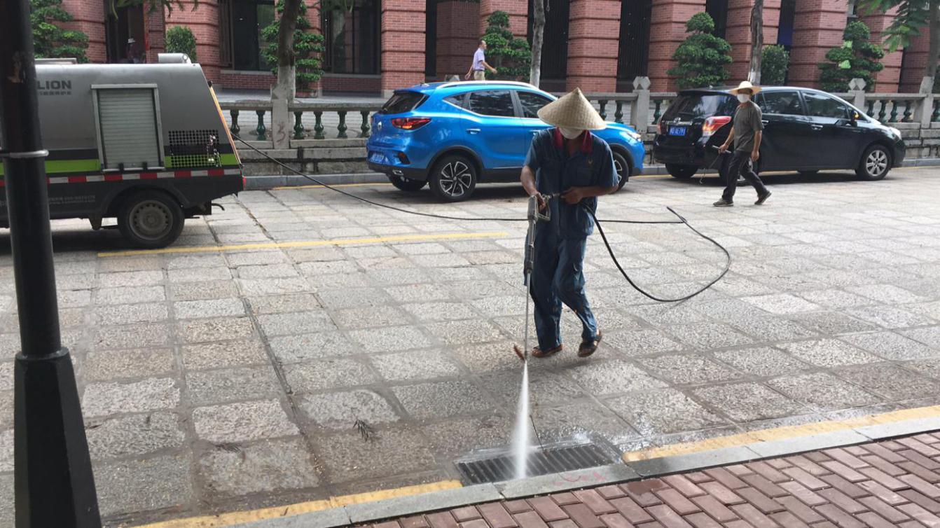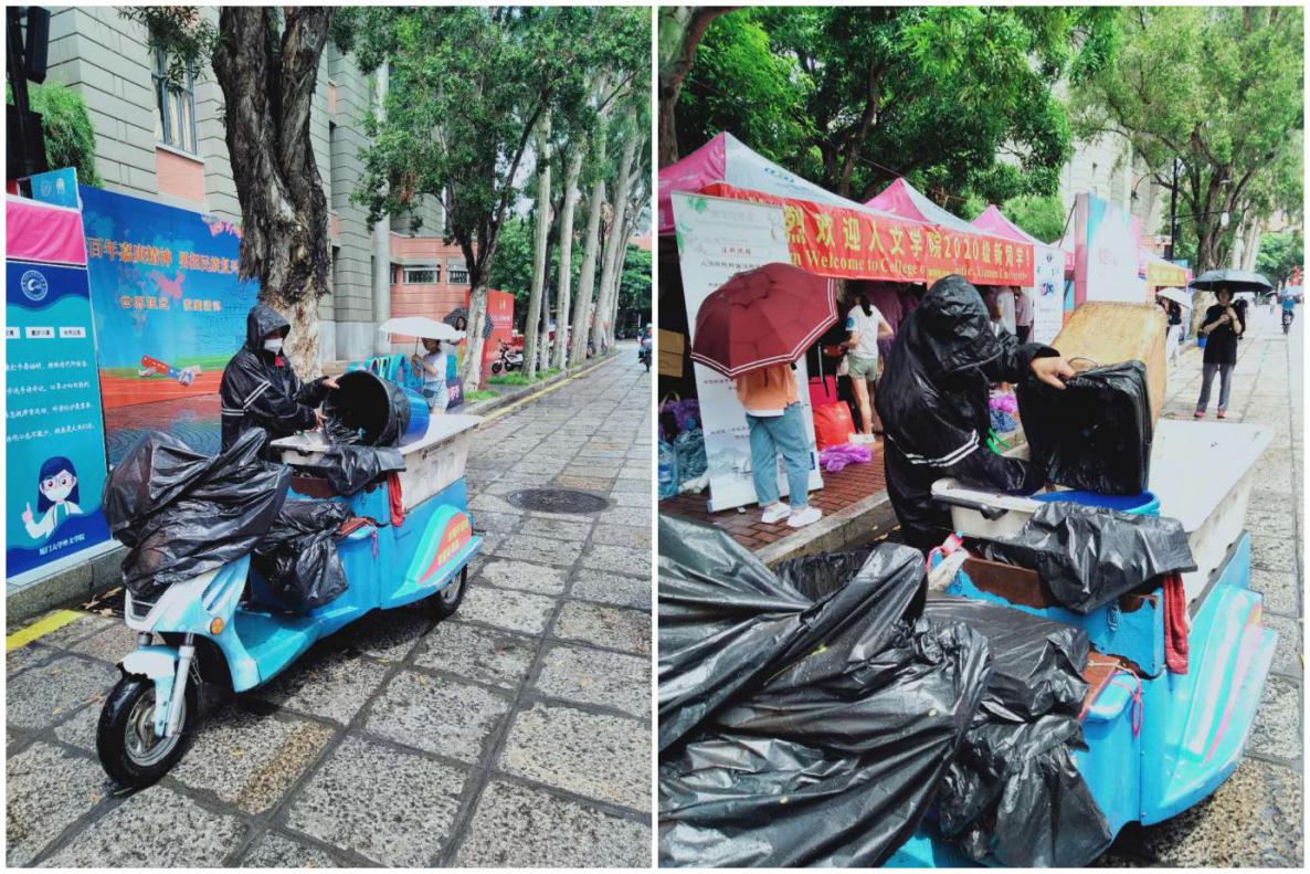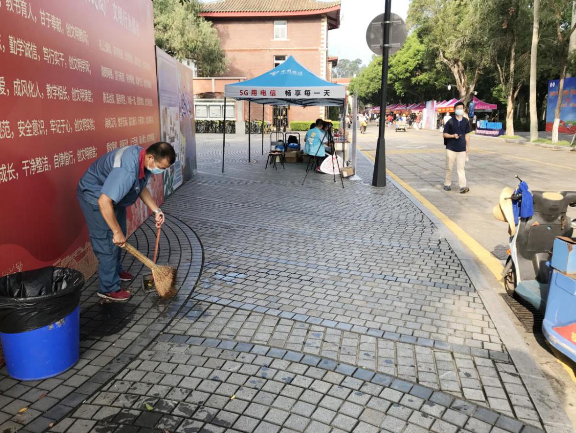 迎新期间,道路保洁员对校园公共环境进行全天候不间断流动保洁并及时清运垃圾,即使突降阵雨也依然坚守,确保以干净整洁的校园环境迎接新生。