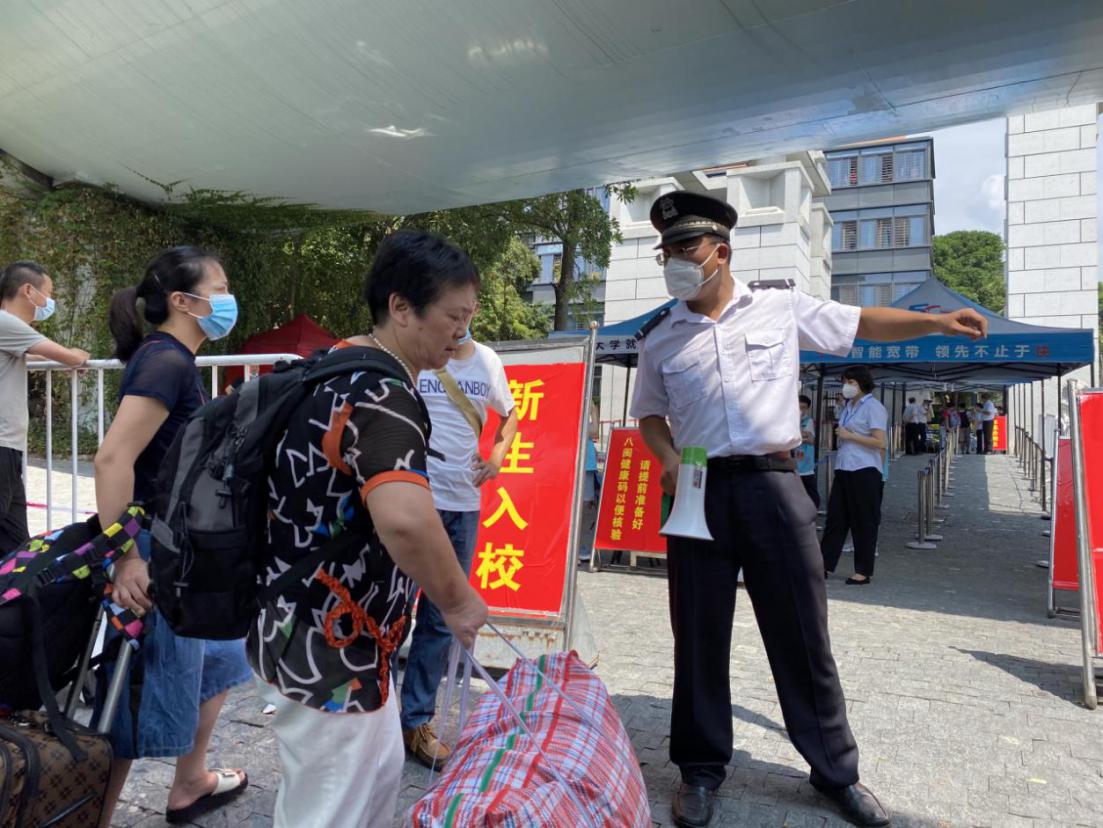 在宿舍园区,中心在各宿舍片区设立了入住办理点,为新生发放宿舍钥匙、空调遥控器等,确保新生安全顺利入住。宿舍工作人员各司其职:有的引导新生按照指定通道进行体温检测后进入园区和宿舍楼栋,有的认真发放宿舍钥匙,有的耐心解答新生住宿问题。部分宿舍安防员在维护好秩序外,还主动帮助新生搬运行李,服务周到又暖心。