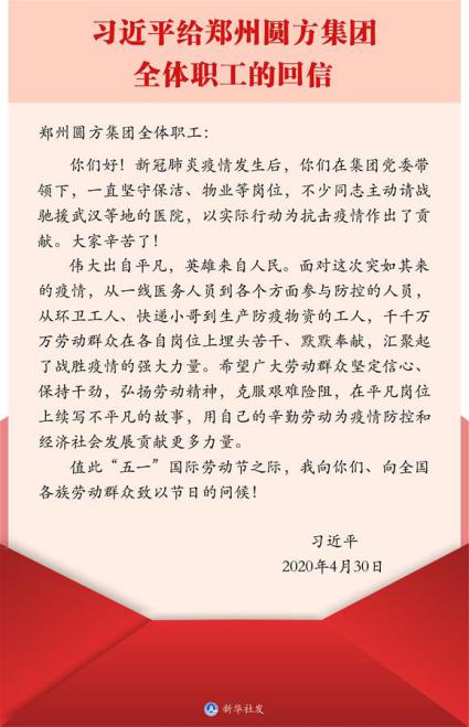 “五一”国际劳动节前夕,中共中央总书记、国家主席、中央军委主席习近平给郑州圆方集团全体职工回信,向他们并向全国各族劳动群众致以节日的问候。