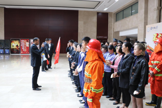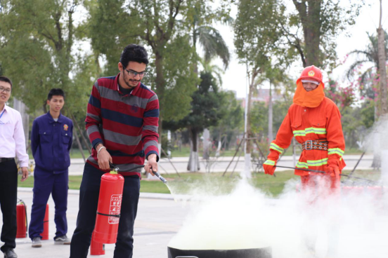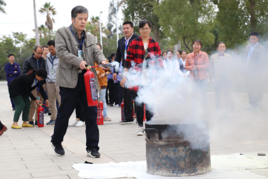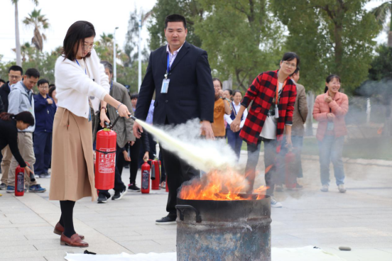 疏散演习结束后,翔安校区保卫办主任陶元升对本次演习进行了点评,并向大家强调了消防的重要性,讲授了应急逃生技巧及注意事项。随后南强物业维序队长陈辉讲解、示范灭火器的正确使用方法、注意事项等内容。讲解结束后,全体参训人员逐一使用灭火器进行灭火操作。