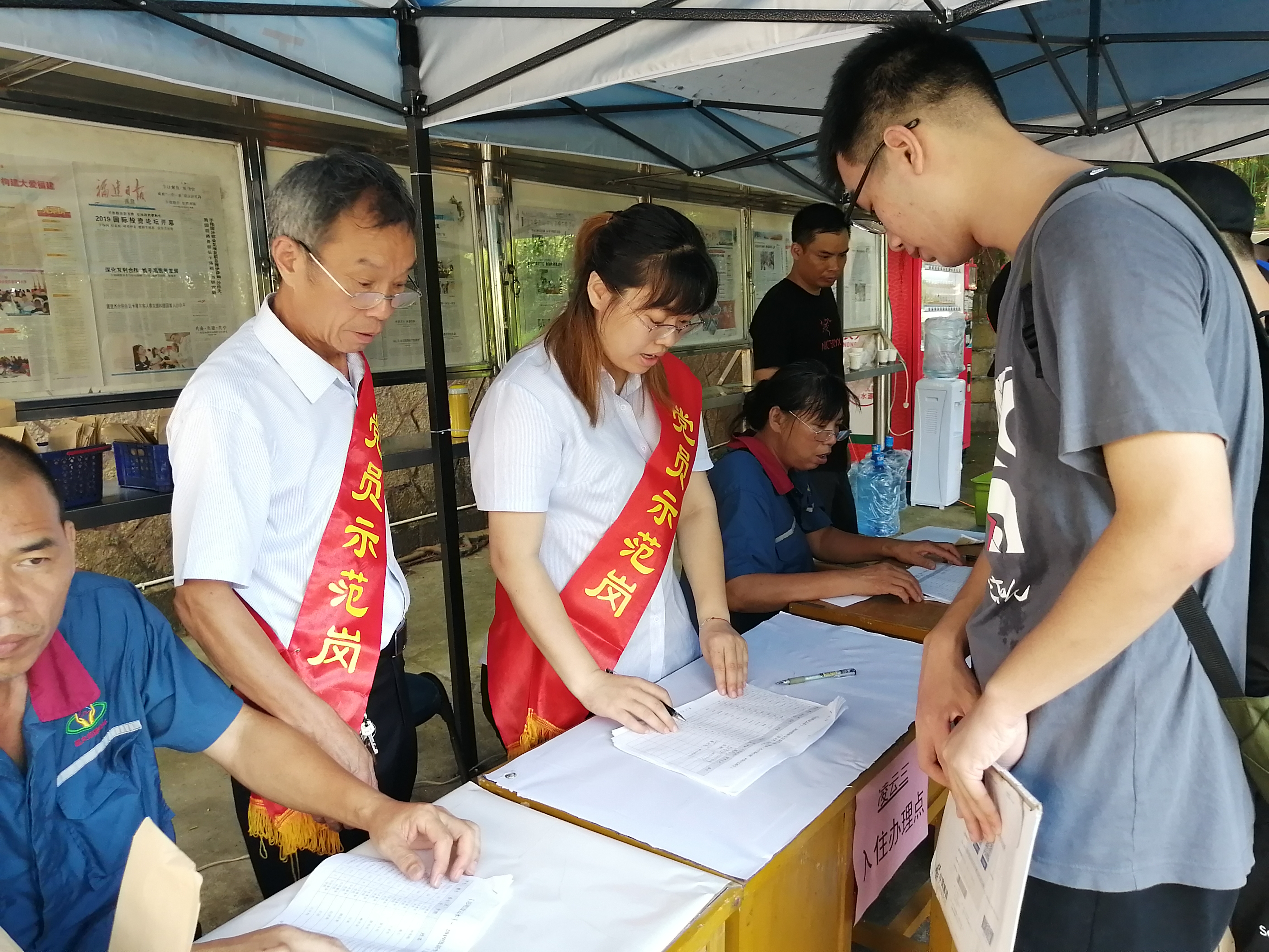 为了确保新生顺利入住,中心在各宿舍片区设立入住办理点,张贴公寓入住须知,公寓支部全体党员发挥先锋模范作用,佩戴“党员示范岗”绶带到各宿舍楼栋迎新点协助办理入住。此外,中心还在办理现场准备了饮用水、纸巾、药品等,为路途劳累的新生及家长提供便利。