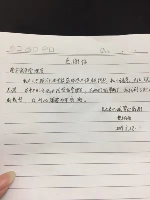 此外,8月27日嘉庚学院迎新当晚10时许,一名新生姗姗来迟,漳州校区南安1-3安防队员许玉胜见新生行李多便上前帮忙搬行李上楼,返回时在楼梯口发现一个黑色钱包,里面有现金1270元及其他证件,便及时上报管理员。管理员联系上学生,钱包物归原主。学生十分感激,特地送来了感谢信。