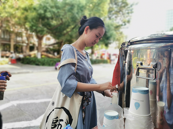 迎新当天,骄阳似火,餐厅熬制消暑凉茶供新生及家长免费饮用,提前开放餐厅用餐区让他们休息歇脚。