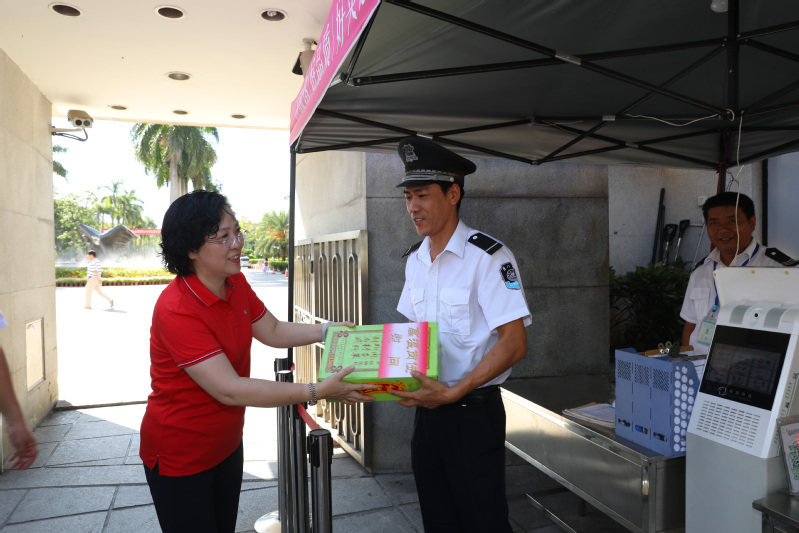 随后,邓朝晖和校工会、后勤集团班子成员一起为员工们送上了空调扇、正气水、绿豆、凉茶等防暑降温物品,并看望慰问了在群贤校门值守的安防人员。