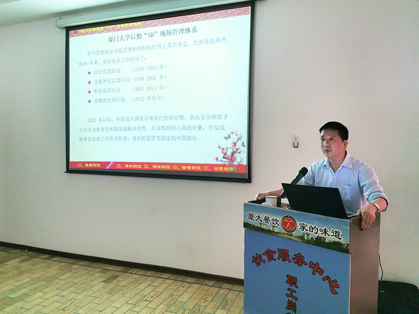 会议还进行了厦门大学后勤“5D”现场管理体系培训。5月6日,竞丰餐厅顺利通过厦门大学后勤“5D”现场管理体系落地验收,随后中心每天两名管理人员前往竞丰餐厅,督导“5D”现场管理体系执行。过程中,餐厅的各项“5D”操作习惯逐渐形成并巩固,取得了阶段性成果。在这个关口,中心召开厦门大学后勤“5D”现场管理体系培训会,集中对管理人员进行培训,进一步强化意识、坚定信心、鼓足干劲,达到人人会“5D”,人人行“5D”的目标。