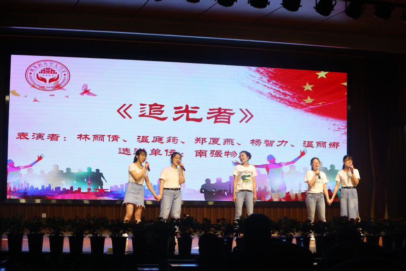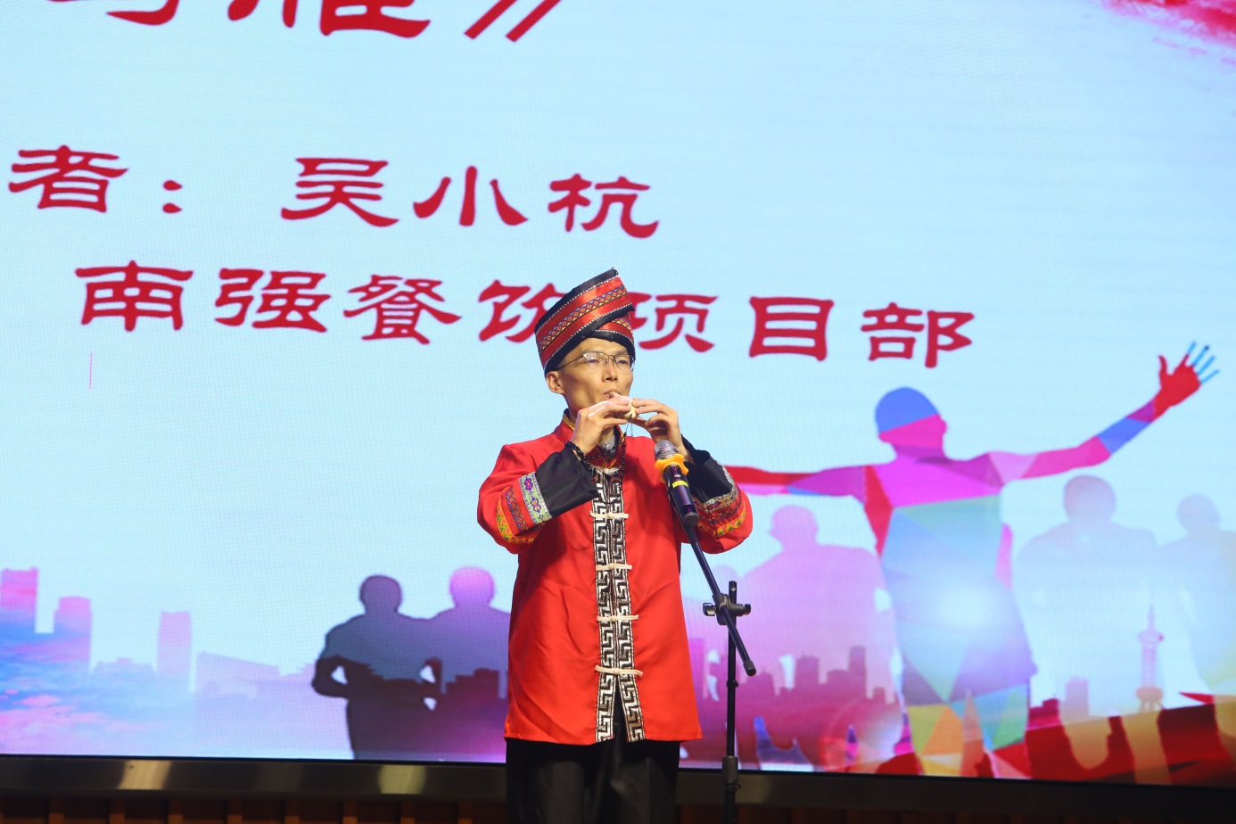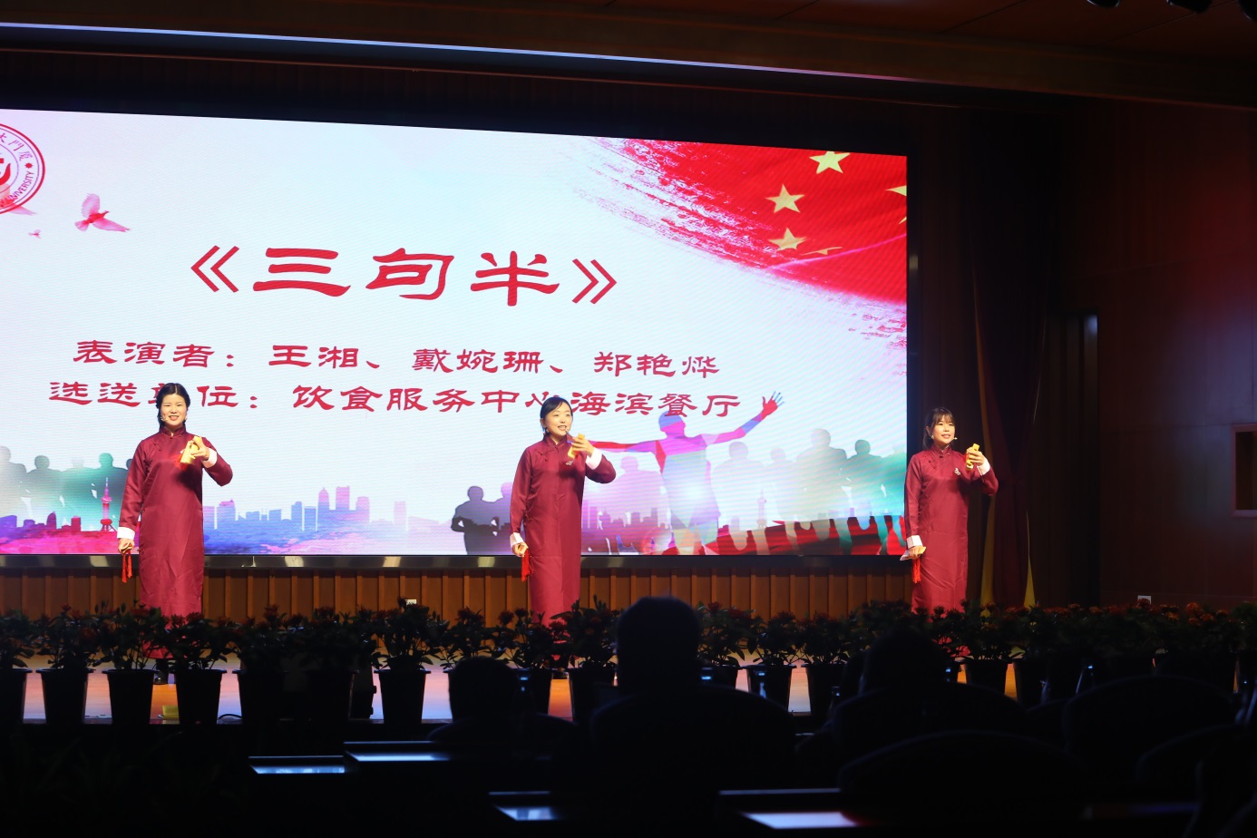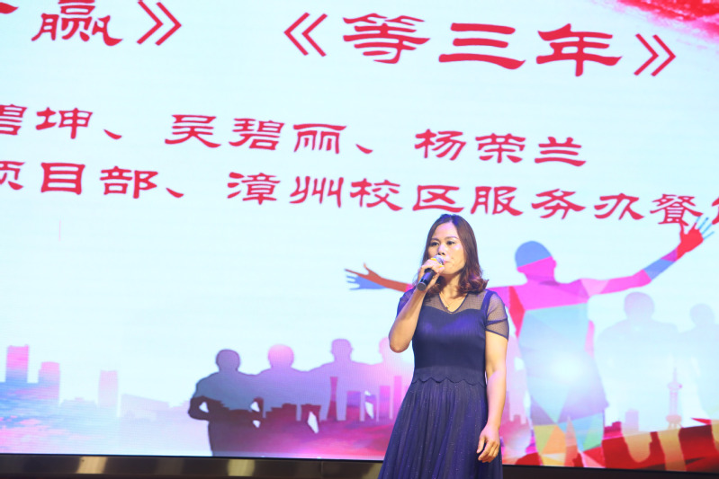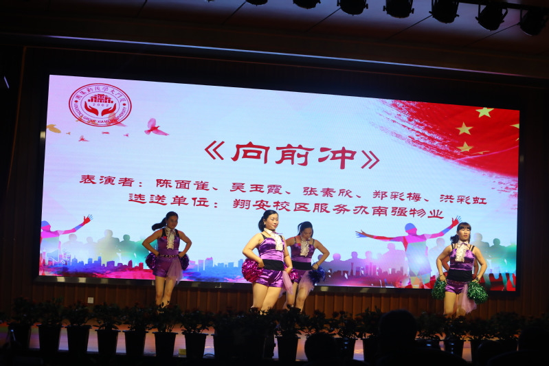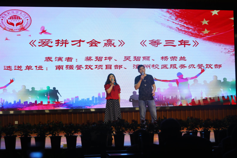 晚会在饮食中心海滨餐厅带来的三句半《锅碗瓢盆曲》中热闹地拉开了帷幕。南强物业、翔安服务办、南强餐饮项目部的歌曲《追光者》、《我是一只小小鸟》、《老男孩》和漳州校区服务办餐饮部的闽南语歌曲串烧《爱拼才会赢》、《等三年》,首首耳熟能详,催人奋进。翔安校区南强物业部的啦啦操表演《向前冲》,南强餐饮项目部的扇子舞《山里人乐的好潇洒》,舞出了后勤员工的热情与快乐。公环中心的独唱《梧桐树》旋律优美,南强餐饮项目部的陶笛演奏《鸿雁》乐声悠扬,展现了后勤员工对音乐的追求。水电中心与租赁部的合唱《歌唱祖国》,雄壮嘹亮的歌声,舞动的五星红旗,以强烈的渲染力把整场晚会推向了高潮。