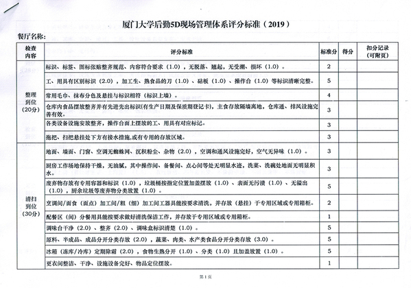 评审会现场,中心主任江森民带领大家实地领略“5D”管理体系在后厨各个区域的应用,大到“5D”管理体系核心思想的介绍,细到工具收纳箱的讲解,在实地参观、考察的过程中,直观感受餐厅后厨的环境卫生、食品安全及操作规范等情况。各位评审人员一边参观,一边对照《厦门大学后勤“5D”现场管理体系评分标准(2019)》,细心查看、严谨打分,不时交流讨论。