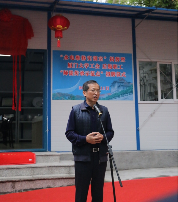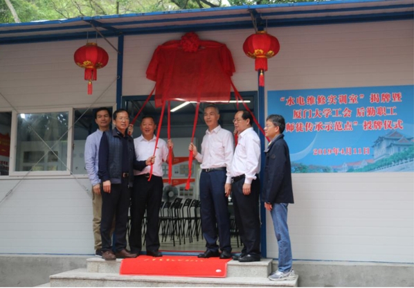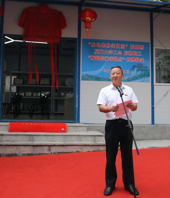 4月11日上午9:06,在水电维修实训室前小广场,后勤集团党委书记刘立荣宣布:“水电维修实训室”揭牌暨厦门大学工会后勤职工“师徒传承示范点”授牌仪式正式开始。厦门大学工会常务副主席叶鹏飞、副主席李招淡,厦门集美职业技术学校校长杜志忠、校长助理庄国华及部分教学管理部门负责人,后勤集团总经理林公明等集团班子以及各单位负责人、一线员工代表参加了仪式,仪式由后勤集团党委副书记邓泽君主持。