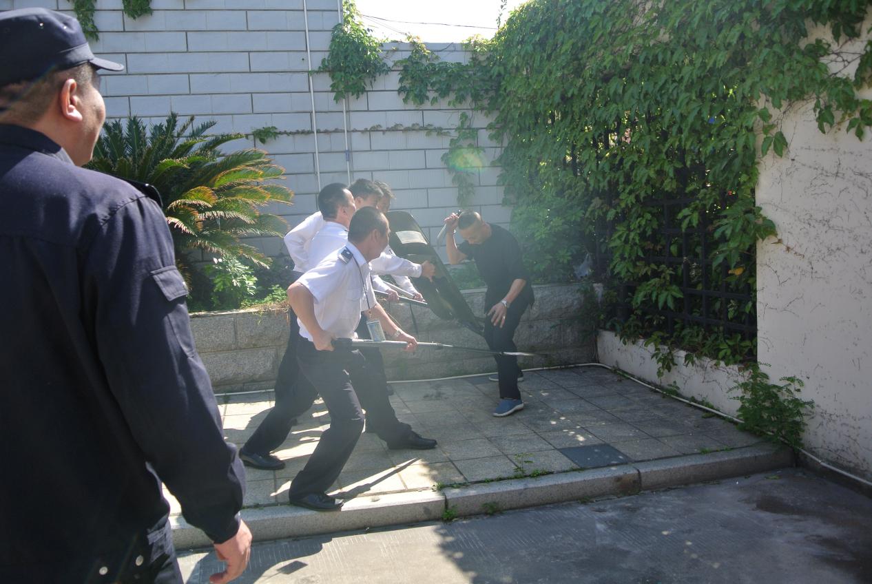 演练模拟一名疑似精神病人男子手持铁质器具闯入校内,门岗保安发现该名男子有伤害群众倾向,立即向现场主管报告,一边告知周围人员迅速撤离现场,一边和该男子周旋并控制住,现场主管立即拨打110报警,随后辖区派出所民警迅速到场处理。
