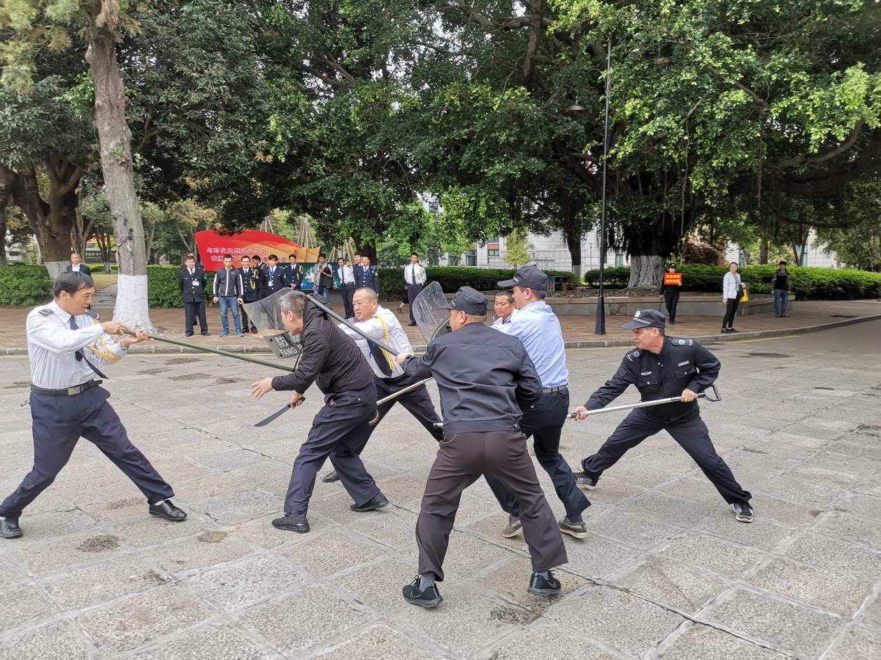 实战演练开始前,大学路派出所民警就防恐工具的使用进行了专项培训,特别对盾牌、腰叉、齐眉棍的单独使用和配合使用、对歹徒的制服技巧进行了现场操作演示。
