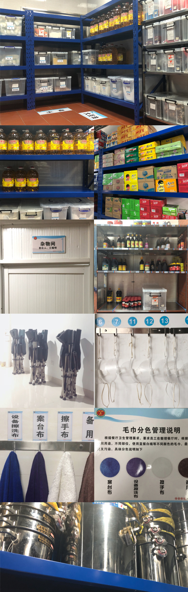 明确区域分工、制作区域管理卡,责任到人;将原值班室调整为仓库,购置货架,分类归置;增设杂物间、空调恒温间,改善验收室办公条件,拆装棋牌室吊顶;增设员工休息室,购置午休床,提高员工午休质量;进行毛巾分色管理,最大限度杜绝交叉污染;培养员工养成良好的操作习惯,做到地板无水、无油,设备整洁明净;制作手机存放柜,上班期间统一存放员工手机;注重日常培训和专业技能提升,定期进行岗前一刻,提高卫生、安全和服务意识,进一步落实“5D”管理体系。