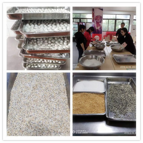 上午9点,餐厅工作人员与甲方员工用花生馅儿、芝麻馅儿、花生芝麻白糖混合馅儿DIY汤圆