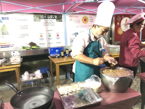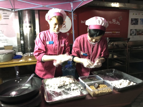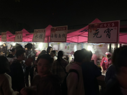 几枚游戏币即可换取一份美食,活动开始不久,美食摊位前便围满了闻讯而来“食客”。这边的师傅手速极快的包着水饺,引来了几位阿姨的围观“学习”,那边的沸水中翻滚着白润的元宵,等待的女生们已经馋得急不可耐,具有闽南特色的面线糊和春卷也排起了长队。