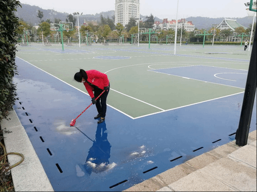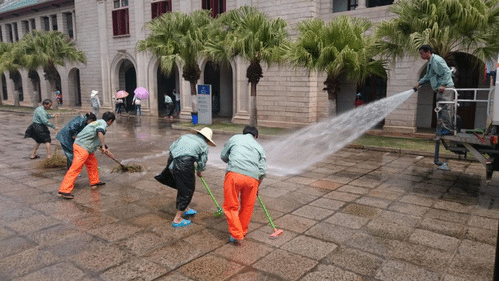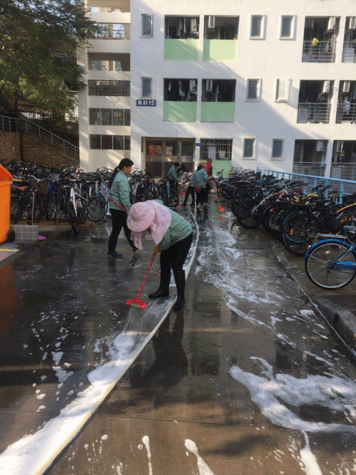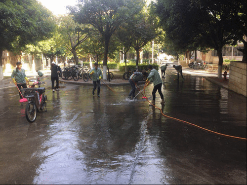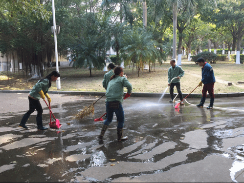 公环中心各部门对校园公共区域、主干道、学生宿舍、公共教室、运动场、安防岗亭、办公场所进行了全面卫生大扫除。