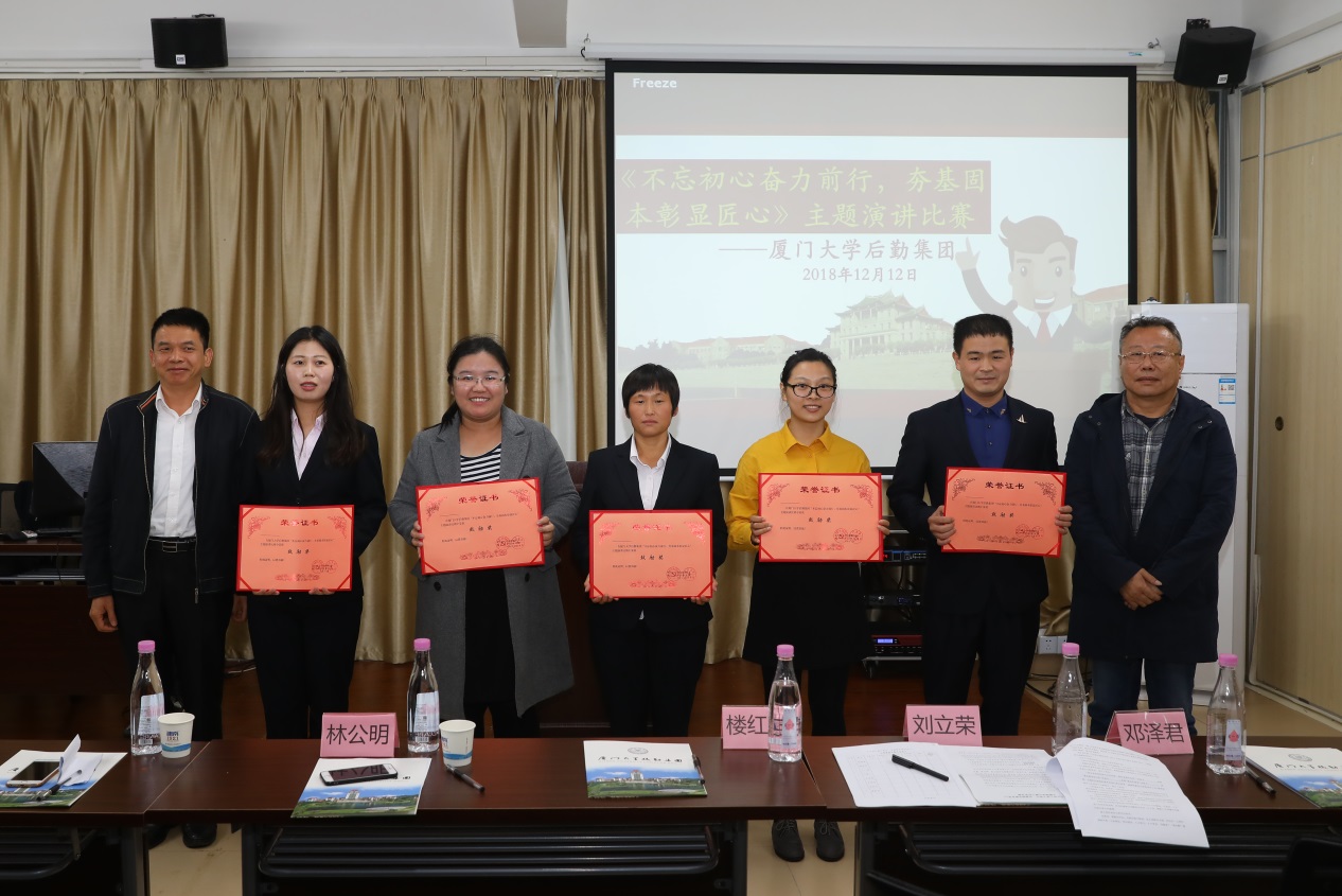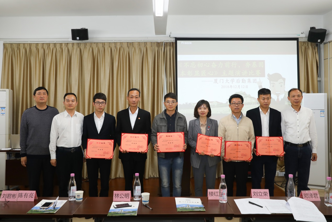 今年是后勤集团以“一流意识、一流标准、一流服务、一流业绩”为目标的一流后勤建设与标准建设年,回首前路,硕果累累,展望未来,我们信心百倍!为促进后勤集团员工思想道德建设,提高全体员工的文明素质,充分展示后勤集团员工的精神风貌,集团于2018年12月12日14点半在海韵职工宿舍活动室举办“不忘初心奋力前行,夯基固本彰显匠心”演讲比赛。此次活动邀请到了厦门大学宣传部副部长楼红英老师及后勤集团领导班子担任评委。