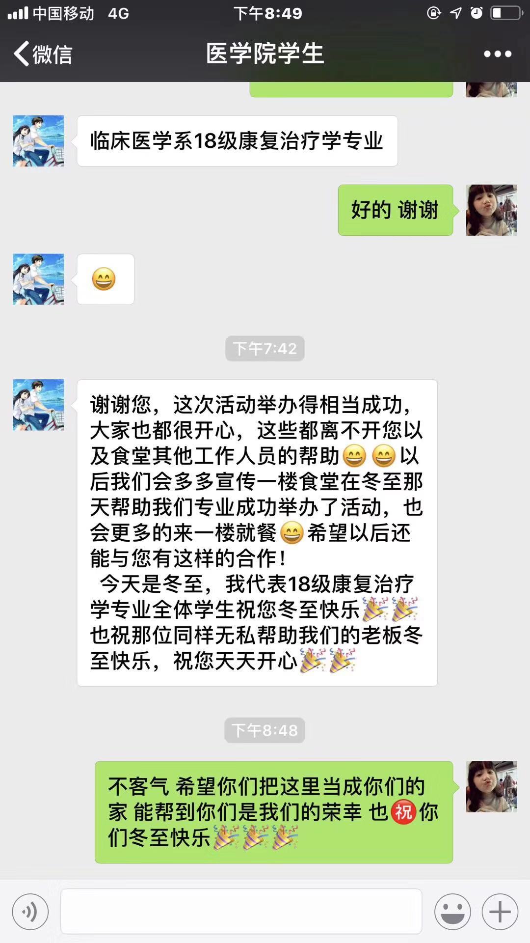 医学院一学生微信上向餐厅保管表达对餐厅的感谢