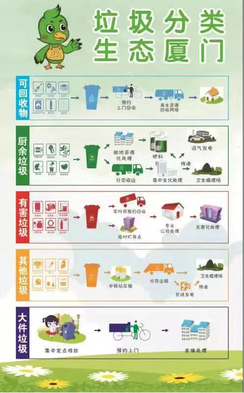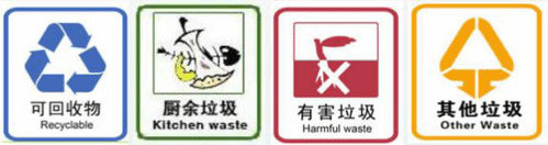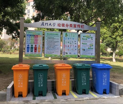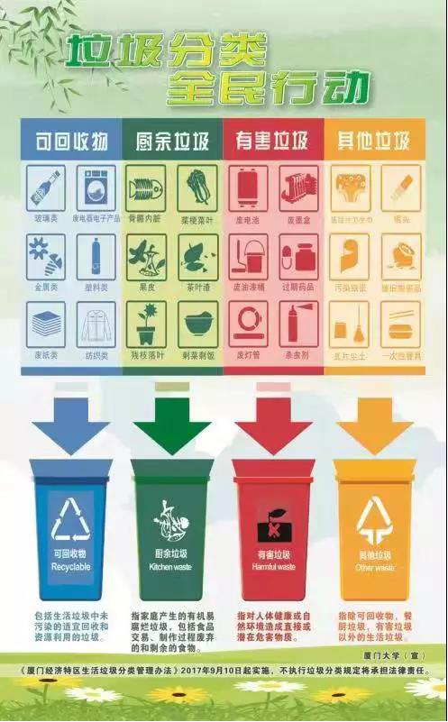 根据我校实际情况,按照厦门市规定的厨余垃圾、可回收垃圾、有害垃圾、其它垃圾四种类别进行生活垃圾分类。