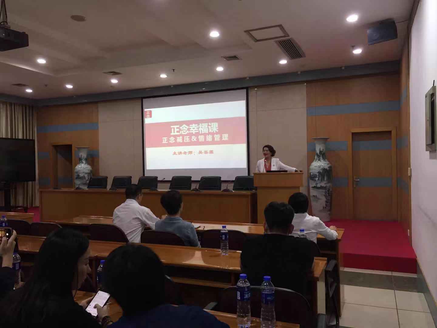 吴芸霏老师引入了当下最为先进的心理减压训练方式:正念减压法,首先通过自己对职场工作的感悟,深入浅出的为大家介绍如何在生活、工作中减缓自己的压力;其次,通过一个个案例,结合实际,为大家展示他人如何解决生活中、职场上遇到的困难以及所要保持的心态;最后,利用一段“冥想放松”的音乐,让大家放松身心,卸下烦恼,了悟人生。课程中,吴老师还与大家一起进行了几种简单的减压训练和专注力训练,带领大家舒展双臂、放松心智。