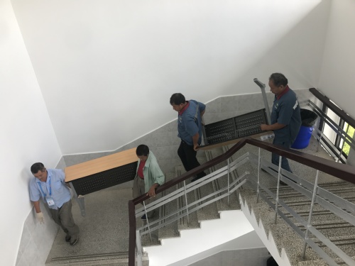 此前,根据大赛竞赛组要求,中心对南强二比赛教室的课桌椅进行了大调整,先后进行课桌椅搬迁5批次,共涉及1662张桌子、2432张椅子。因搬迁量大且复杂,为了高效、精准满足比赛需求,中心公共教学服务部管理员与志愿者提前探讨、优化课桌椅搬迁方案,并在各部门员工团结协作下攻克了难关。