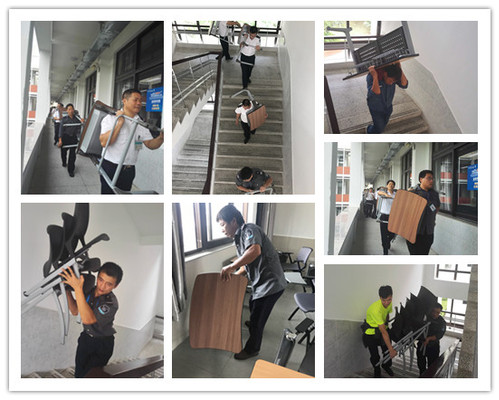 大赛结束后,为了将课桌椅及时归位,10月15日,安防部、海韵物业部、学生公寓服务部、绿化保洁部协同公共教学服务部快速将南强二47间教室所有课桌椅搬迁归位、摆放整齐,并做好教室卫生保洁工作,确保第二天师生可以正常上课。