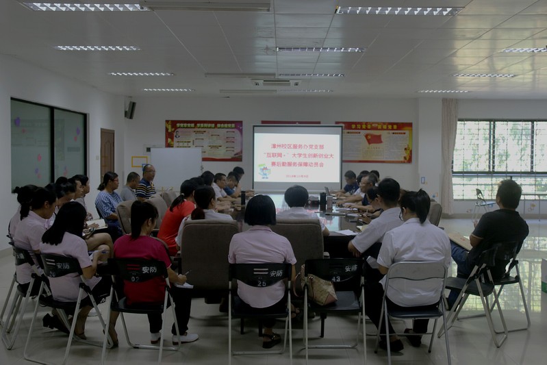 10月9日下午,漳州校区服务办党支部召集全体党员和各部门二级岗及以上人员在会议室,召开“互联网+”大学生创新创业大赛后勤保障工作动员会,会议由党支部书记吴泱同志主持。