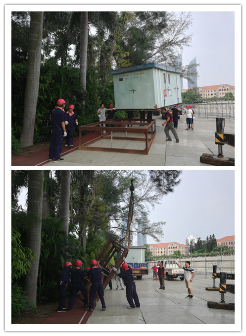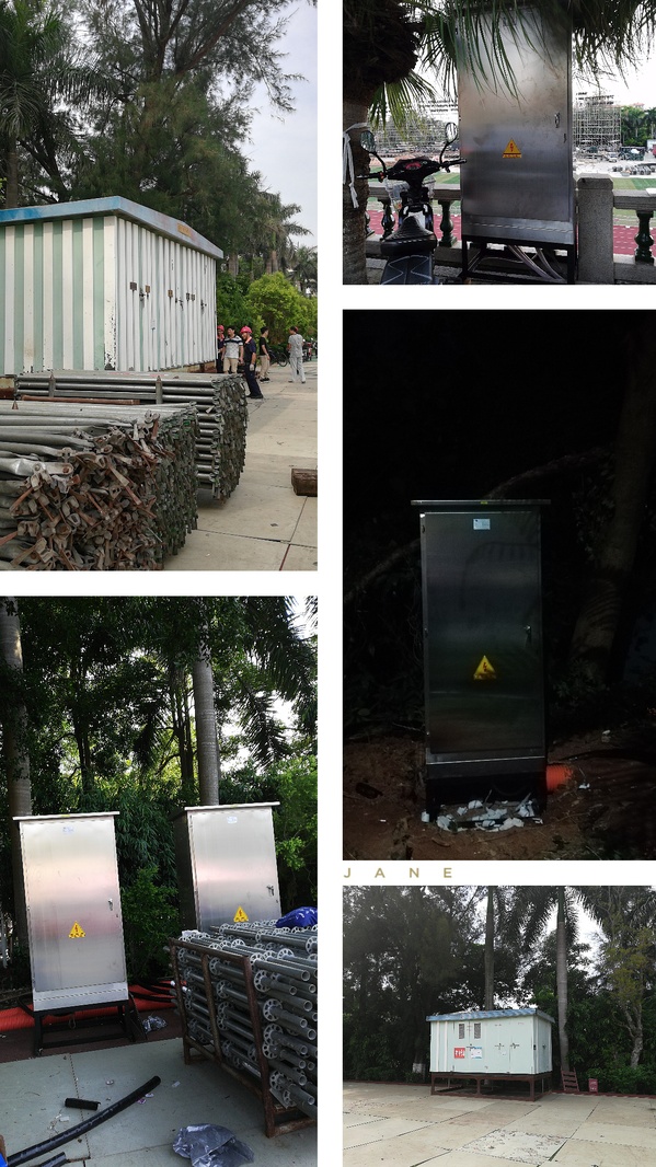 根据大赛要求,需要在上弦场舞台后方安装2台临时箱变,并在校内新增10台动力柜,以确保大赛期间用电万无一失。9月21日,中心领导带领维修师傅们进行现场勘察,并部署施工方案。