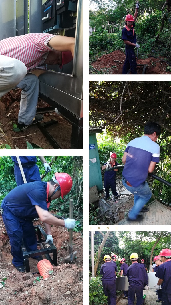 中心副主任李春海、工程维修部经理郑文炉现场部署箱变安装的位置
