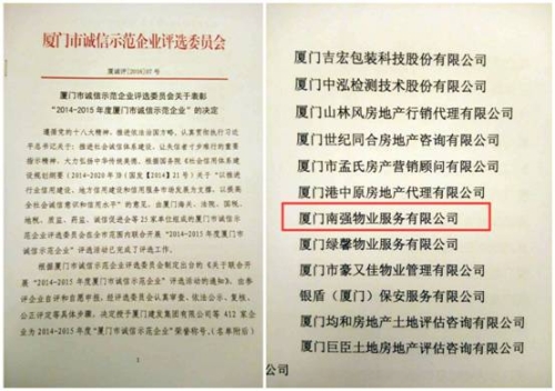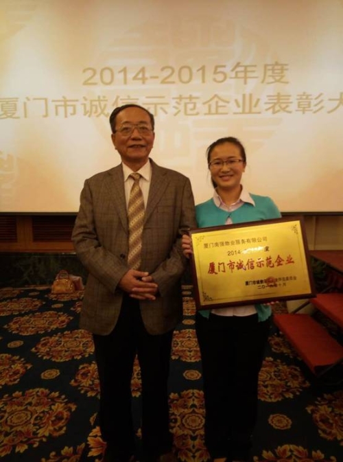 南强物业服务有限公司自成立以来,遵循“尚品共赢”的经营理念,坚持诚信经营,不断提高企业资信。公司深刻认同企业诚信不仅是社会和广大用户对企业的要求,也是企业的社会责任,更是企业自身发展壮大的首要条件和立足之本。企业有诚信,标志着企业的成熟与发展,也是企业和企业家人格力量的表现。此次公司获评“厦门市诚信示范企业”,既是对公司诚信经营的肯定,更是一种鞭策和鼓舞,南强物业公司将不忘初心,继续诚信经营,以优质服务回报客户。