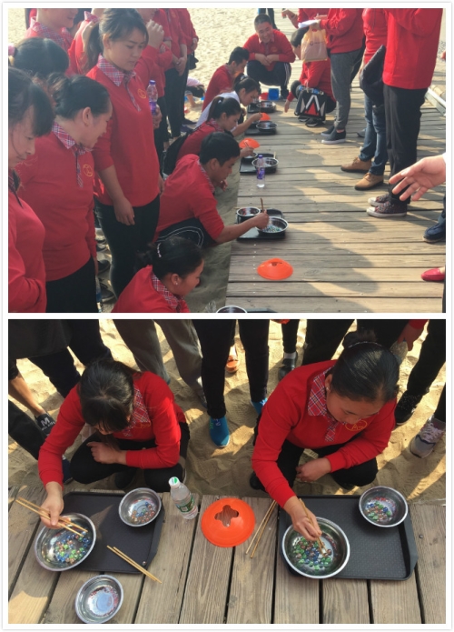 趣味运动会共设有四项活动,有脑力比拼的八十分大赛,有较量力气的拔河大赛,有竞技弹跳的沙滩袋鼠跳,更有趣味十足的夹弹珠比拼。