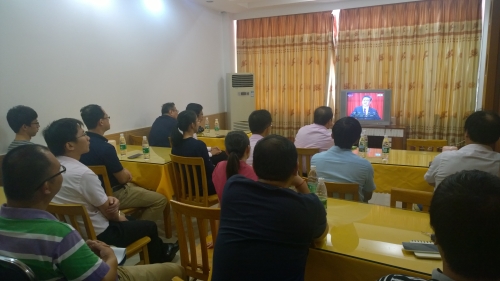 在收看大会现场直播的过程中,到场的党员同志和入党积极分子在逐字逐句地认真聆听习近平总书记重要讲话之余,不时凝神思索、提笔记录习近平总书记讲话的重要表述。在直播结束后的交流讨论环节,支部党员同志们一致认为:习近平总书记气势磅礴、内涵深刻的重要讲话对长征精神做出了全面、系统的阐释与提炼,把长征纪念活动推向了高潮。讲话全文既表达了对历史的深切缅怀和认知,又观照了现实,使全国各族人民得到了一次最广泛的教育与启示,展示了一个崛起中大国的崭新形象和风范,展现了一个大国领袖的深邃智慧和切实担当。