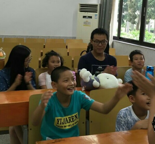 而另一间教室内坐着四到六年级的小朋友们。活动前,三个刚上四年级的小男孩十分活泼,趴在桌子上,讨论着热门游戏与动画片,并不时地在教室跑动嬉戏。志愿者肖楚与小朋友们积极互动,并教了他们几个成语,其中有一个是南辕北辙,小朋友们十分聪明,不仅很快明白了成语的意思,甚至讲出了成语的来源。接下来小男孩们和志愿者陈竑屹玩起了词语接龙,小朋友们你一言,我一语,在欢乐的游戏时光里提升了成语运用能力。