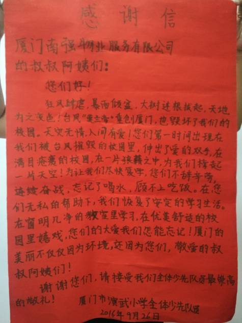 升国旗仪式结束后,在全体师生面前,吴老师代表学校向后勤集团南强物业参与学校灾后清障工作的全体人员表示感谢,她告诉学生们,在今年超强台风“莫兰蒂”登陆后,厦大后勤集团南强物业的叔叔阿姨们第一时间赶来学校关心慰问,在勘察完学校情况后,派来了数十位工作人员,到总校和理工校区进行绿化和围栏的抢险,清扫台风造成的各类废弃物,并调动设备清理操场满地碎玻璃,超负荷工作每天达近15个小时,只为赶在复课前还孩子们一个安全美丽的校园。她特别教诲学生们要对为学校灾后重建辛勤付出和关怀自己成长的各界人士怀有感恩之心,懂得珍惜现在安定的学习环境。
