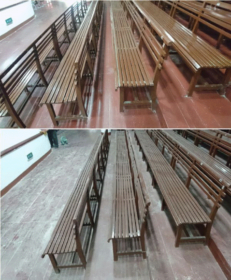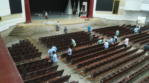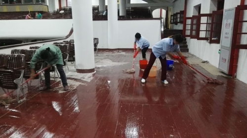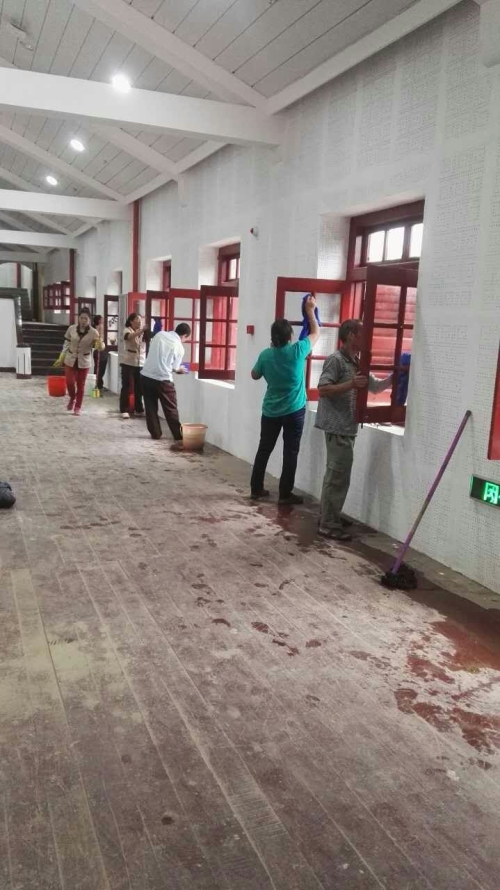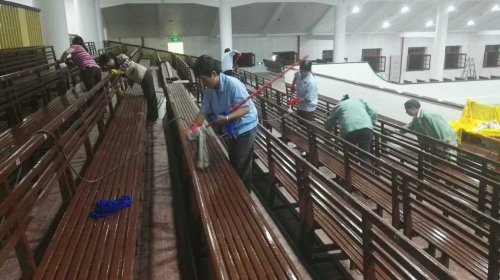 建南大礼堂在整修后灰尘特别多,因此保洁任务繁重。9月12日下午四点到晚上九点,中心调集绿化保洁部、公共教学服务部、运动场馆部共70名员工加班对大礼堂内的地板、玻璃、门窗、座椅等进行全面清洗、擦拭。9月13日一整天,中心32名员工对所有的座椅进行再次擦拭,并擦洗8个卫生间、贵宾室及其走廊、楼梯扶手。9月14日上午又安排8名道路保洁员冲洗大礼堂正门和周边路面,并对建南大礼堂会场外围沟、四周枯树枝、白色垃圾进行彻底清理,共装运30袋垃圾。