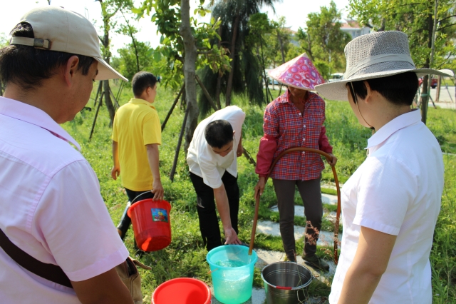 随后,党员同志身先士卒,带领员工,用自带的水桶、脸盆等盛水工具,提水浇灌。在一个多小时的浇灌树木活动中,为800多棵树木浇水定根,为尽快还原一个干净、美丽、有序的校园贡献自己的一份力量。