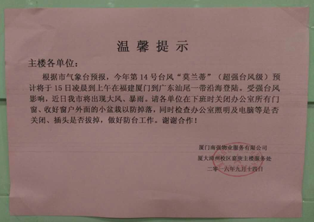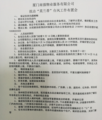今日凌晨3:05分,今年第14号台风“莫兰蒂”在福建厦门翔安区沿海登陆,登陆时强度为强台风级(48米/秒,15级),南强物业工作团队守土有责,从接到台风讯息开始就绷紧神经,严格按照抗台预案和项目实际情况落实防御措施,为台风来袭做好全面准备。