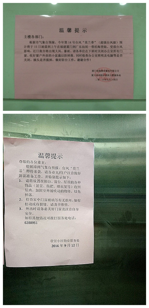 今年第14号超强台风“莫兰蒂”与闽南语“没人在”发音相似。不过,漳州校区服务办“防汛抗台”可不是“没人在”。为有效贯彻学校、集团关于本次防汛抗台安全工作的重要指示精神,继9月13日下午紧急召开防汛抗台专项工作布置会,就全力防御“莫兰蒂”相关安全工作准备进行细化布置后,漳州校区服务办于9月14日上午组织开展了由部门负责人、二级岗管理骨干参加的管理责任区域“风险点”安全检查。